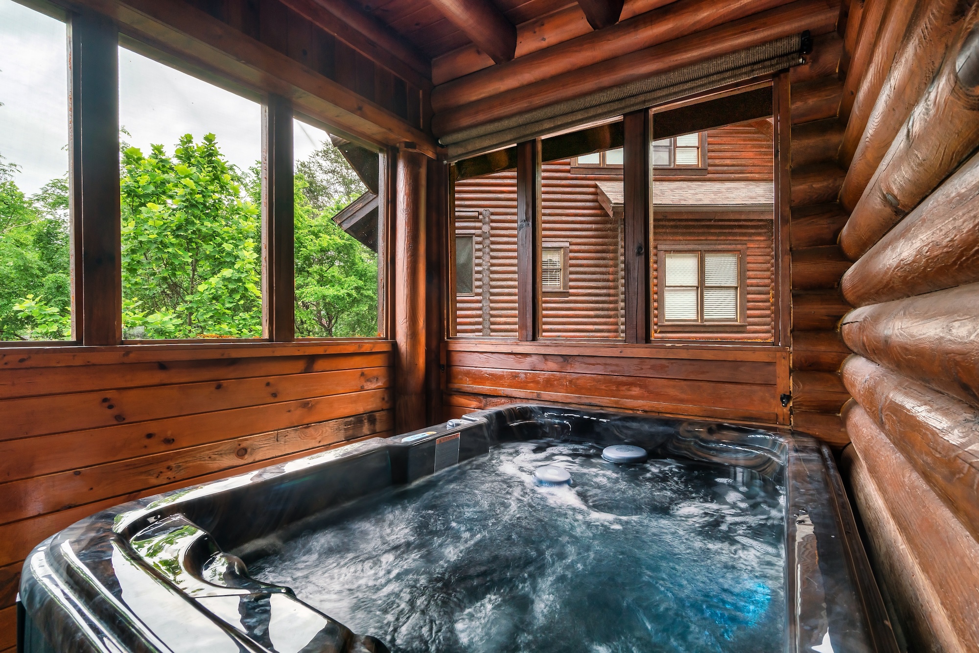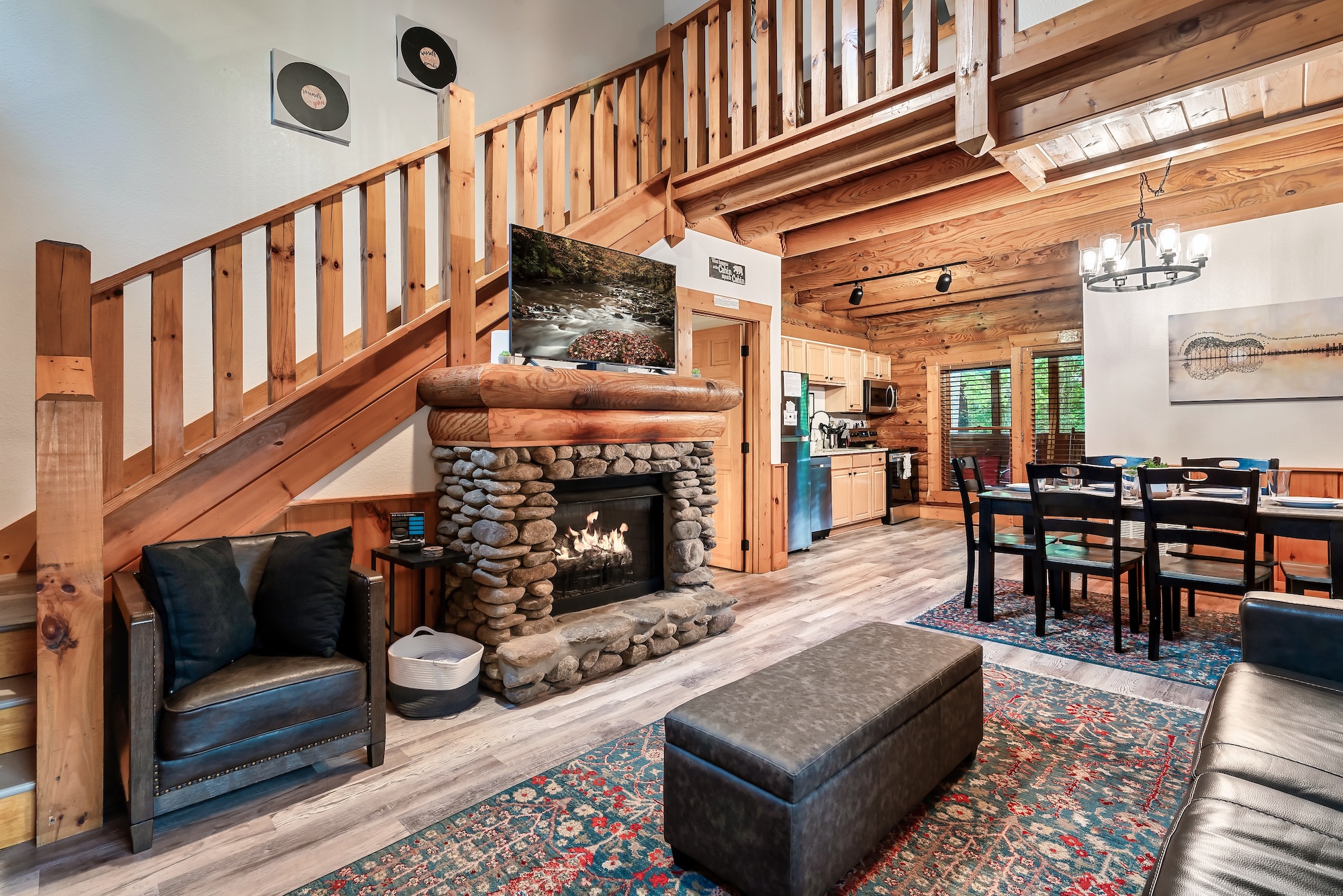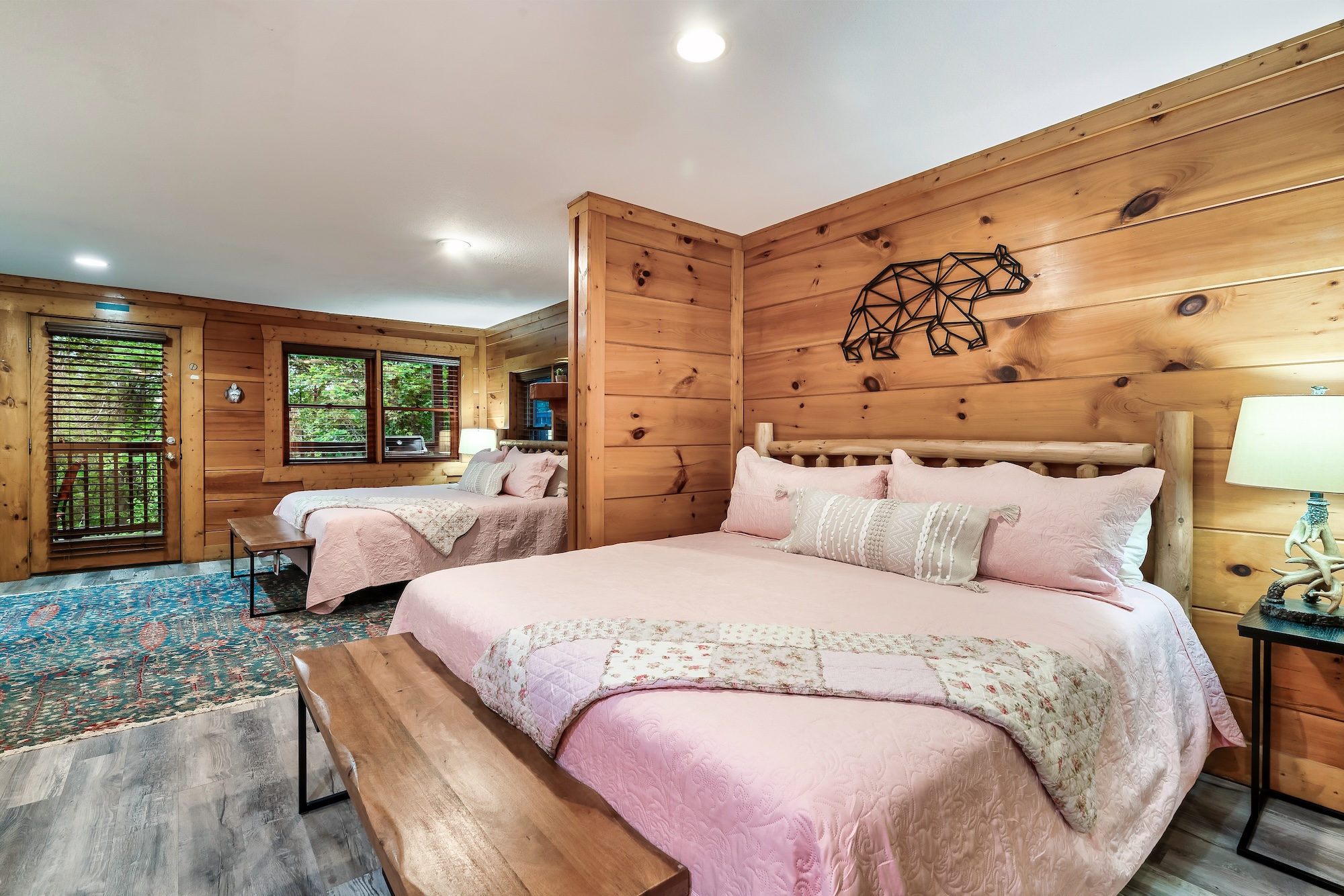 This cabin offers a King Suite on the top floor of the cabin. In the bedroom there is a king bed and an in-room jacuzzi tub outside of the en suite bathroom. The ensuite bathroom includes a shower. The basement setup is like a family suite with kitchenette. There is a king bed, separated by a partial wall – as well as another king and twin daybed and trundle. You can sleep 6 in this basement area. There is a bathroom here with a shower and tub. |