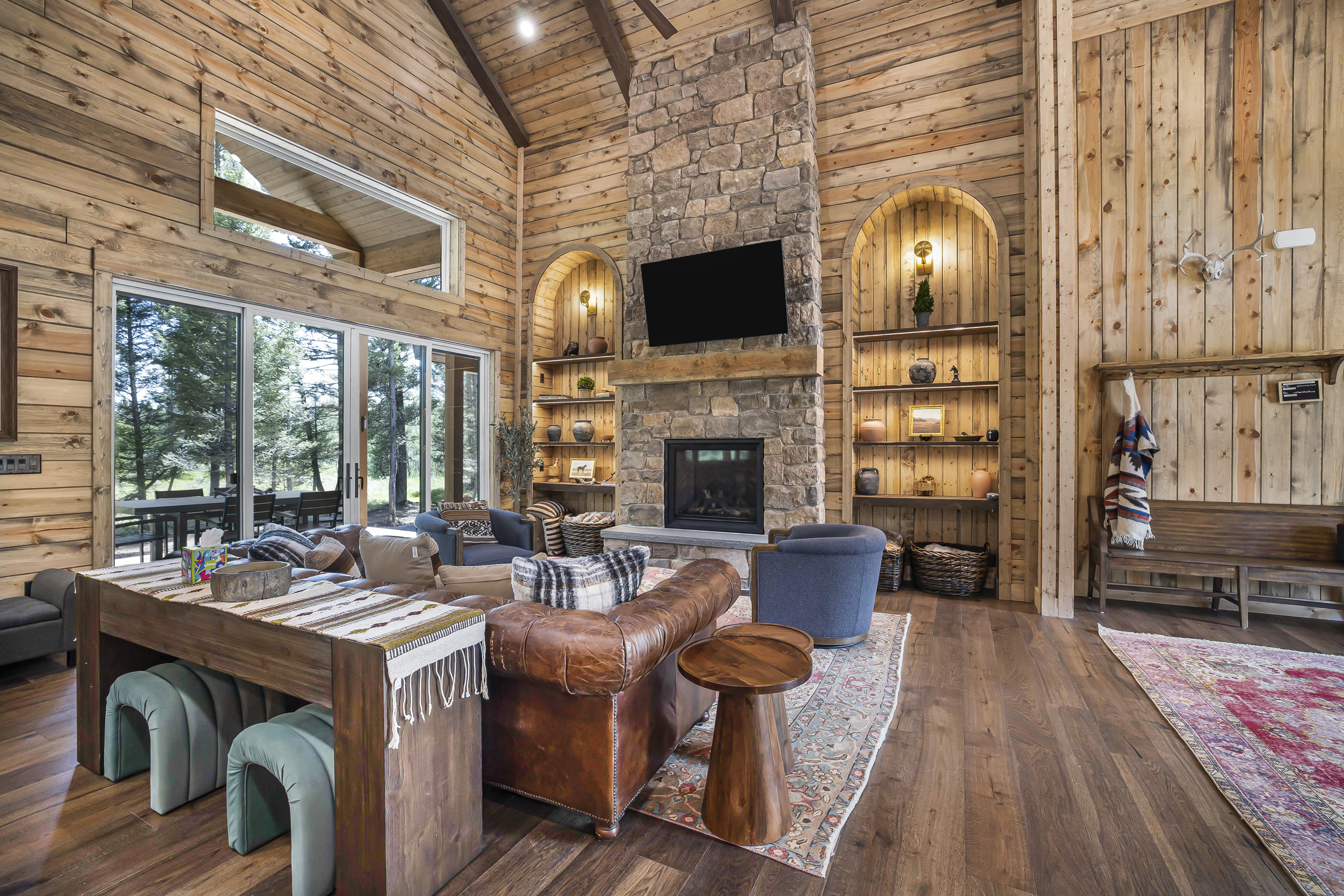 Welcome to The Yellowstone House, where modern comfort seamlessly blends with rustic charm in our custom-built luxury retreat. The common area features a grand stone fireplace and ample seating, providing a cozy spot for everyone to relax after a day of adventure. Whether you’re curling up with a book indoors or exploring the natural beauty just outside, this inviting space sets the stage for unforgettable moments.