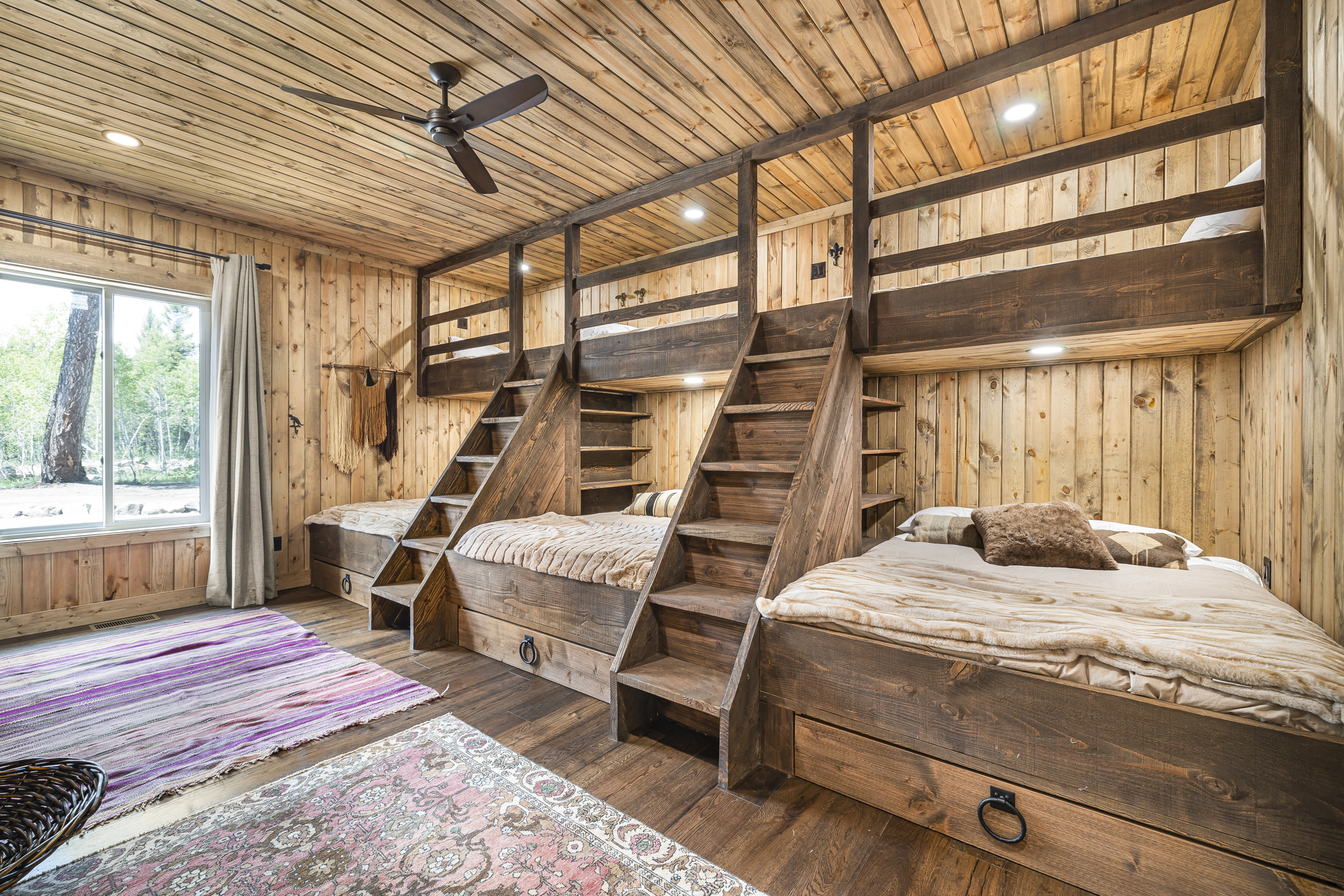 The custom-built bunk room is a favorite among families and friends, offering a cozy retreat with three queen beds below, three twin beds above, a private bathroom, two showers, a smart TV, and outdoor access—perfect for late-night fun and shared adventures.